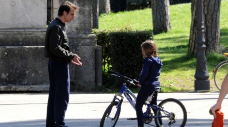 Una tenera giornata al parco giochi per Alessandro Preziosi in dolce compagnia della piccola figlia Elena e della sua bicicletta.