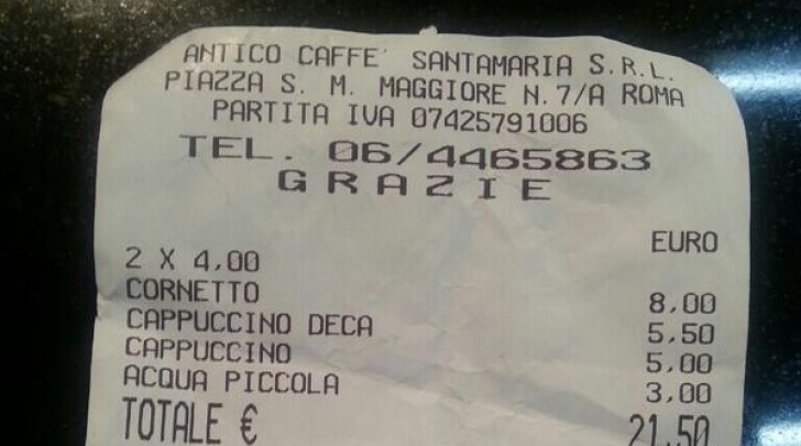 Guardando il conto sono 4 euro a cornetto, 5 euro per il cappuccino e 5,50 euro per il cappuccino decaffeinato e ben 3 euro per la bottiglietta a mezzo litro d'acqua!