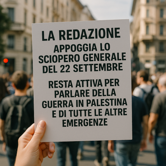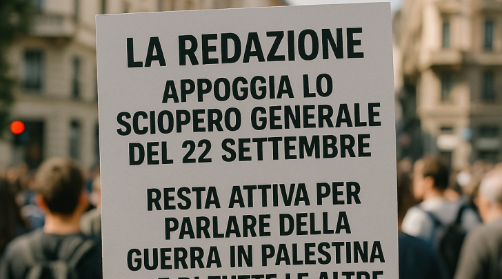 La redazione, nel suo insieme, aderisce con convinzione allo sciopero generale indetto per il 22 settembre, riconoscendone le ragioni e condividendone le motivazioni di fondo. Lo sciopero rappresenta uno strumento legittimo di espressione collettiva, un segnale di partecipazione civile che non intendiamo ignorare né sottovalutare.